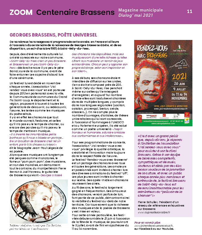 En 2011, à l’occasion des 30 ans de sa disparition, l’association « L’acte chanson » a créé le festival « Saint Gély chante Brassens ».