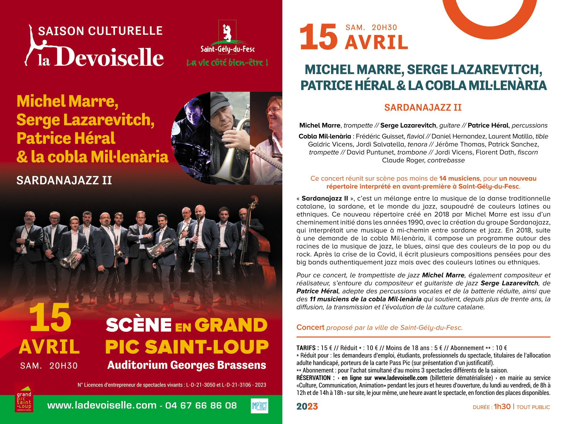 « Sardanajazz II », c’est un mélange entre la musique de la danse traditionnelle catalane, la sardane, et le monde du jazz, saupoudré de couleurs latines ou ethniques. Ce nouveau répertoire créé en 2018 par Michel Marre est issu d’un cheminement initié dans les années 1990, avec la création du groupe Sardanajazz, qui interprétait une musique à mi-chemin entre sardane et jazz. En 2018, suite à une demande de la cobla Mil·lenària, il compose un programme autour des racines de la musique de jazz, le blues, ainsi que des couleurs de la pop ou du rock. Après la crise de la Covid, il écrit plusieurs compositions pensées pour des big bands authentiquement jazz mais avec des couleurs latines ou ethniques.
