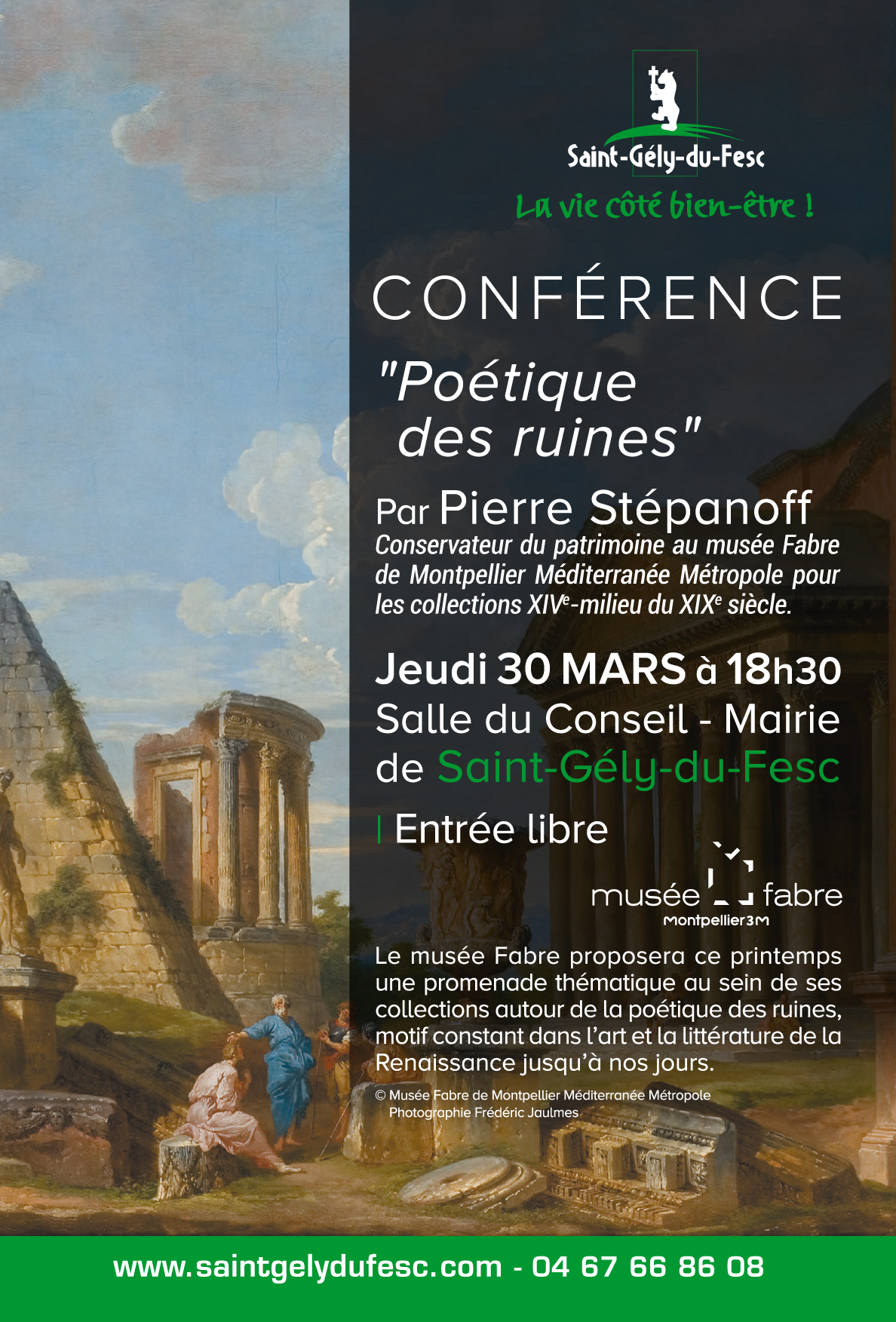 De la Renaissance jusqu’à nos jours, la ruine est un motif prégnant dans l’imaginaire poétique et artistique européen. Éveillant le souvenir des glorieux empires défunts, elle suscite fascination, émulation et espoir d’une renaissance mais elle peut également plonger le spectateur dans une rêverie mélancolique sur le temps qui passe. A de multiples reprises, les artistes comme les écrivains se sont fait les interprètes de ces différents sentiments. Le fonds de peinture et de dessin du musée Fabre est particulièrement marqué par ce motif esthétique. C’est donc à une promenade poétique parmi les ruines, au cœur des collections, que le visiteur sera convié. La conférence évoquera la permanence comme les transformations de cet imaginaire, où se lit en filigrane l’histoire que l’homme entretien avec le temps, avec le passé comme avec son futur. Pierre Stépanoff