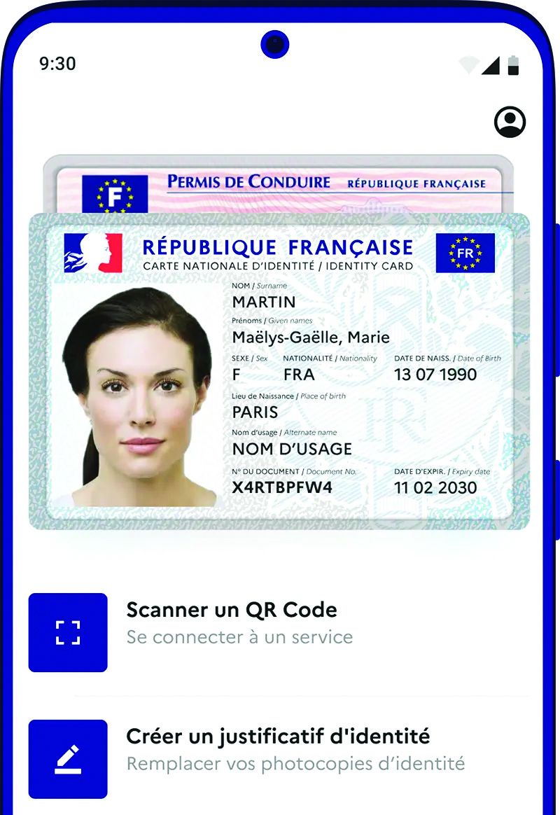 France identité est une application permettant de créer son identité numérique, faciliter son utilisation et accéder à des usages dédiés (fourniture d’un justificatif d’identité à usage unique, accès aux services FranceConnect, justification de son identité ou de son droit à conduire…).