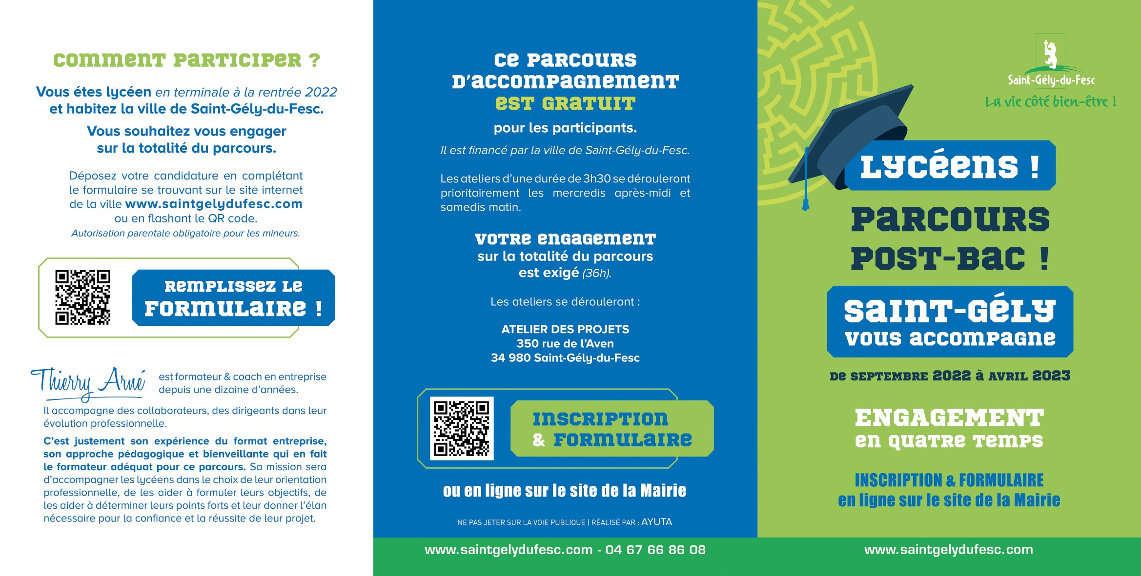 La municipalité de Saint-Gély-du-Fesc vous accompagne dans votre orientation post-bac. Il s’agit d’un parcours s’étalant de septembre 2022 à avril 2023 vous proposant, après un premier entretien individuel, une série d’ateliers collectifs animés par un formateur-coach sur le choix de votre orientation professionnelle, la rédaction de CV et lettres de motivation, l’accompagnement à la prise de parole pour convaincre ou encore la gestion du temps et du stress ; le tout en lien avec les démarches à accomplir sur Parcoursup. Ce parcours vous intéresse ? Nous vous remercions de bien vouloir répondre au questionnaire ci-dessous sachant que seulement un maximum de 60 lycéens pourront être accompagnés. Nous vous remercions d’ores et déjà de la transparence de vos réponses qui favorisera votre accompagnement et soyez assurés de notre respect de la confidentialité des informations transmises.