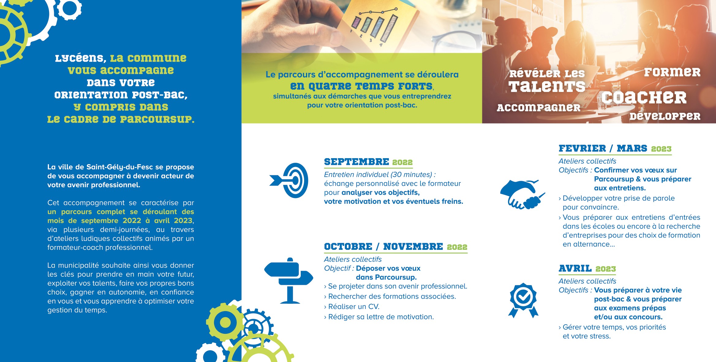 La municipalité proposera à partir de septembre un parcours d’accompagnement aux lycéens désireux de devenir acteurs de leur avenir professionnel. Cet accompagnement s’adresse aux lycéens en terminale à la rentrée 2022.