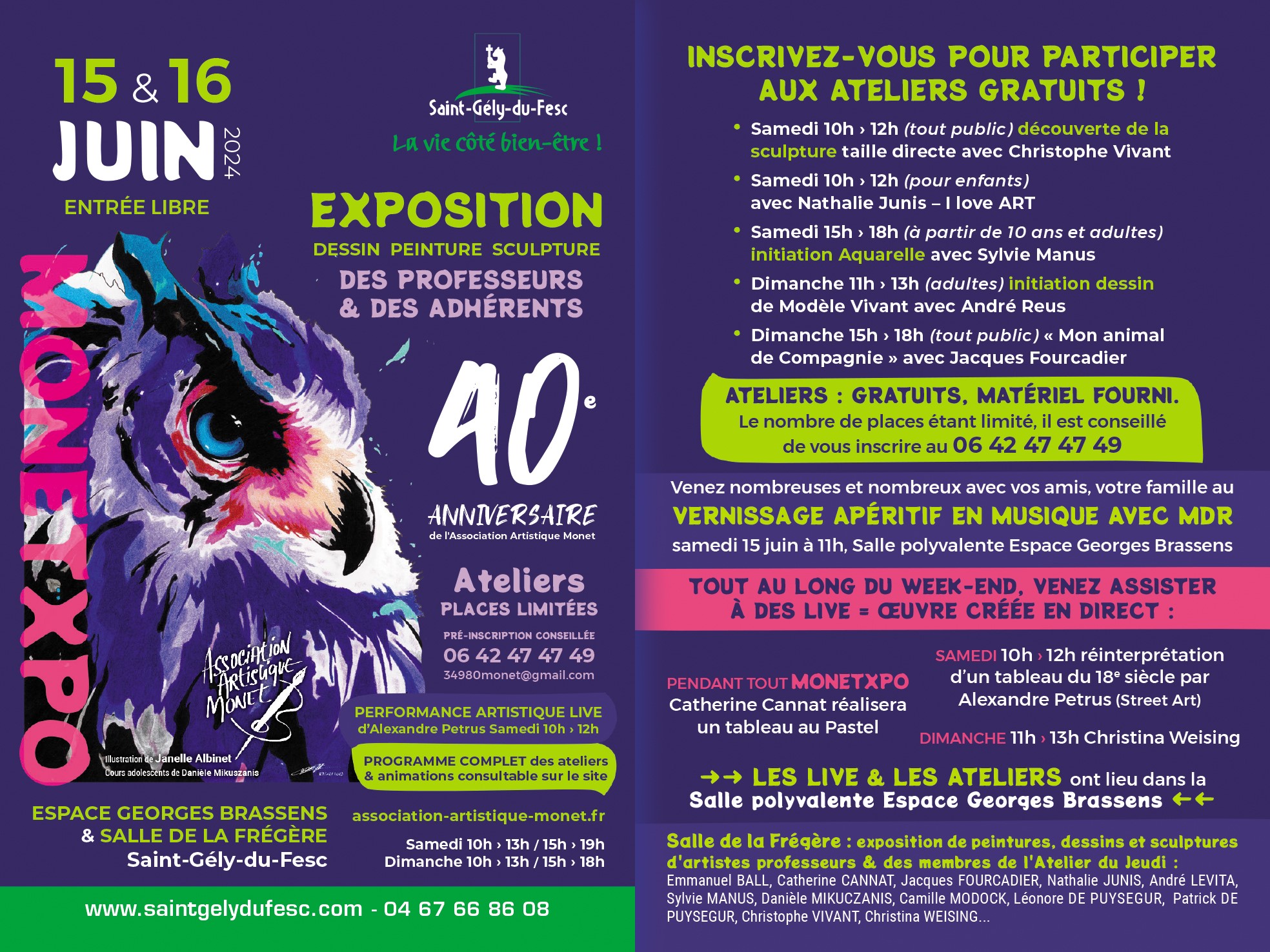 Pour cette 40e édition anniversaire, l’Association Artistique Monet vous invite à venir profiter d’un programme particulièrement riche. Nouveaux et anciens professeurs exposeront dans la Salle de la Frégère et différentes animations seront organisées dans la Salle polyvalente Espace Georges Brassens