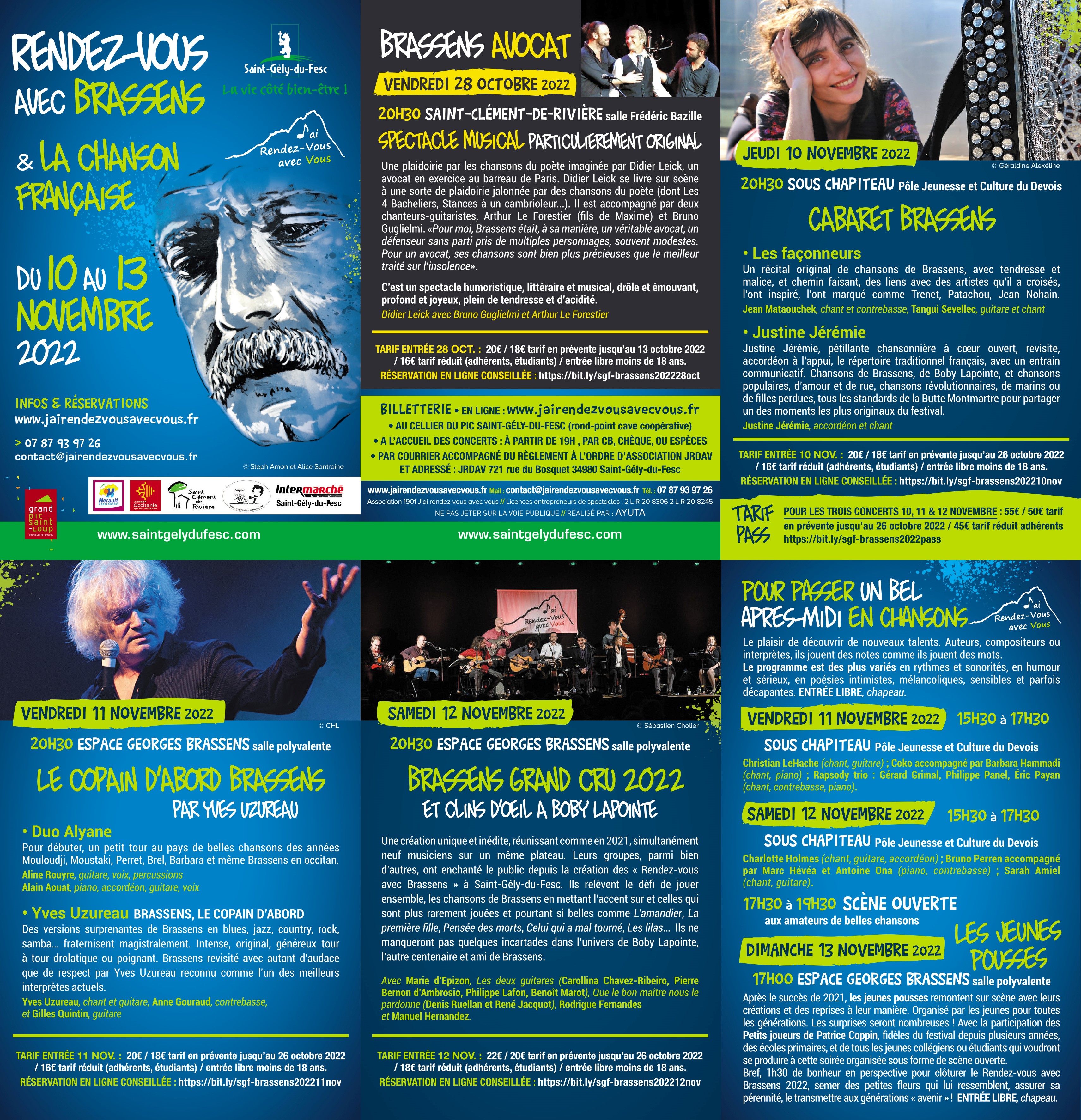 Le Rendez-vous 2022 avec Brassens nous réserve de belles pépites. Les organisateurs sont attachés à des programmations artistiques de qualité, originales, innovantes et respectueuses de l’œuvre. Cette année, les chansons de Boby Lapointe et Mouloudji, égale- ment centenaires, mais aussi d’autres auteurs, s’invitent autour de Brassens au festival.