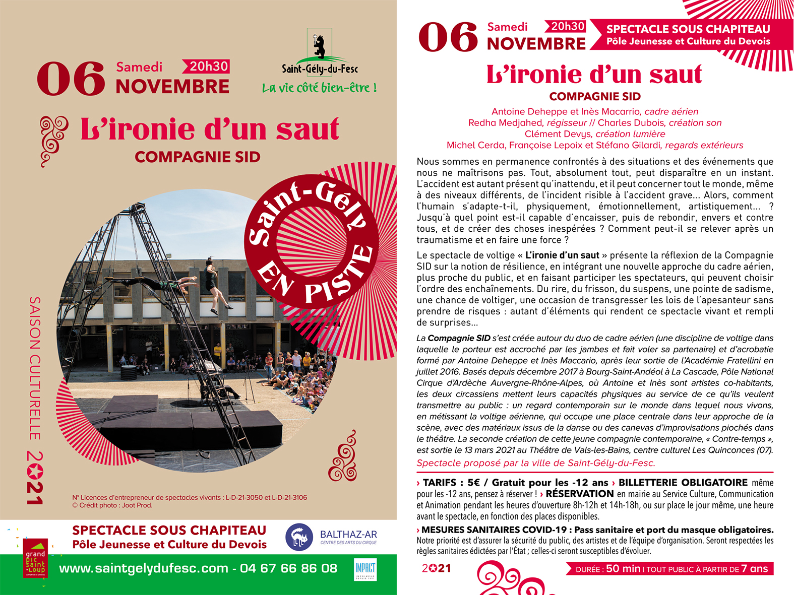 Le spectacle de voltige « L’ironie d’un saut » présente la réflexion de la Compagnie SID sur la notion de résilience, en intégrant une nouvelle approche du cadre aérien, plus proche du public, et en faisant participer les spectateurs, qui peuvent choisir l’ordre des enchaînements. Du rire, du frisson, du suspens, une pointe de sadisme, une chance de voltiger, une occasion de transgresser les lois de l’apesanteur sans prendre de risques : autant d’éléments qui rendent ce spectacle vivant et rempli de surprises…