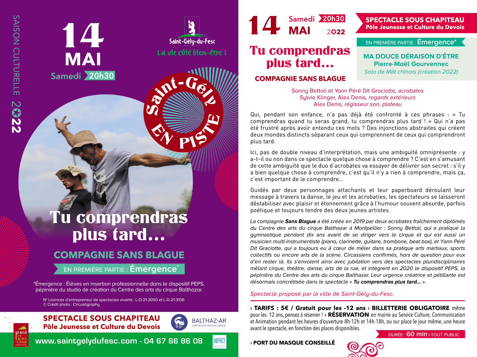 La compagnie Sans Blague a été créée en 2019 par deux acrobates fraîchement diplômés du Centre des arts du cirque Balthazar à Montpellier : Sonny Bettoli, qui a pratiqué la gymnastique pendant dix ans avant de se diriger vers le cirque et qui est aussi un musicien multi-instrumentiste (piano, clarinette, guitare, trombone, beat box), et Yann Péré Dit Graciotte, qui a toujours eu à coeur de mêler dans sa pratique arts martiaux, sports collectifs ou encore arts de la scène. Circassiens confirmés, hors de question pour eux d’en rester là. Ils s’envolent ainsi avec jubilation vers des spectacles pluridisciplinaires mêlant cirque, théâtre, danse, arts de la rue, et intègrent en 2020 le dispositif PEPS, la pépinière du Centre des arts du cirque Balthazar. Leur urgence créatrice et pétillante est désormais concrétisée dans le spectacle « Tu comprendras plus tard... ».