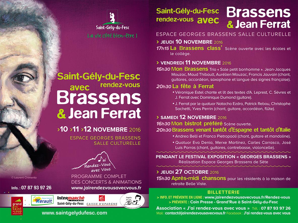 L’édition 2016 du rendez-vous avec Brassens, se double d’un rendez-vous avec Jean Ferrat. Le festival est organisé par l’association « J’ai rendez-vous avec vous » en partenariat avec la Communauté de Communes du Grand Pic Saint-Loup, la ville de Saint-Gély-du-Fesc, et avec le soutien technique du département de l’Hérault.
