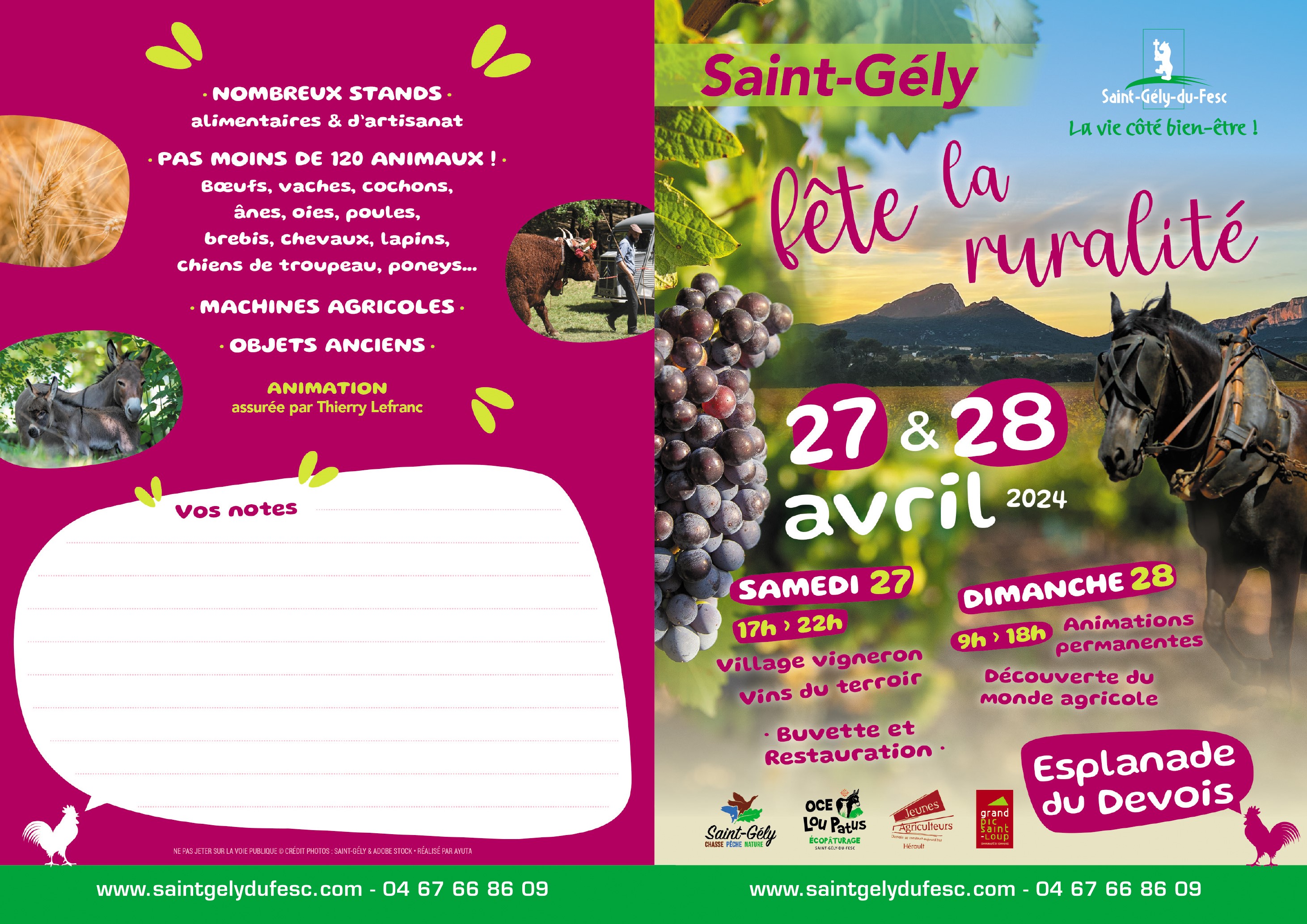 La municipalité, les associations Saint-Gély Chasse Pêche Nature et OCE lou Patus fêtent la ruralité au printemps en plein cœur de ville, sur l’Esplanade du Devois, un site arboré de près de 5 hectares.