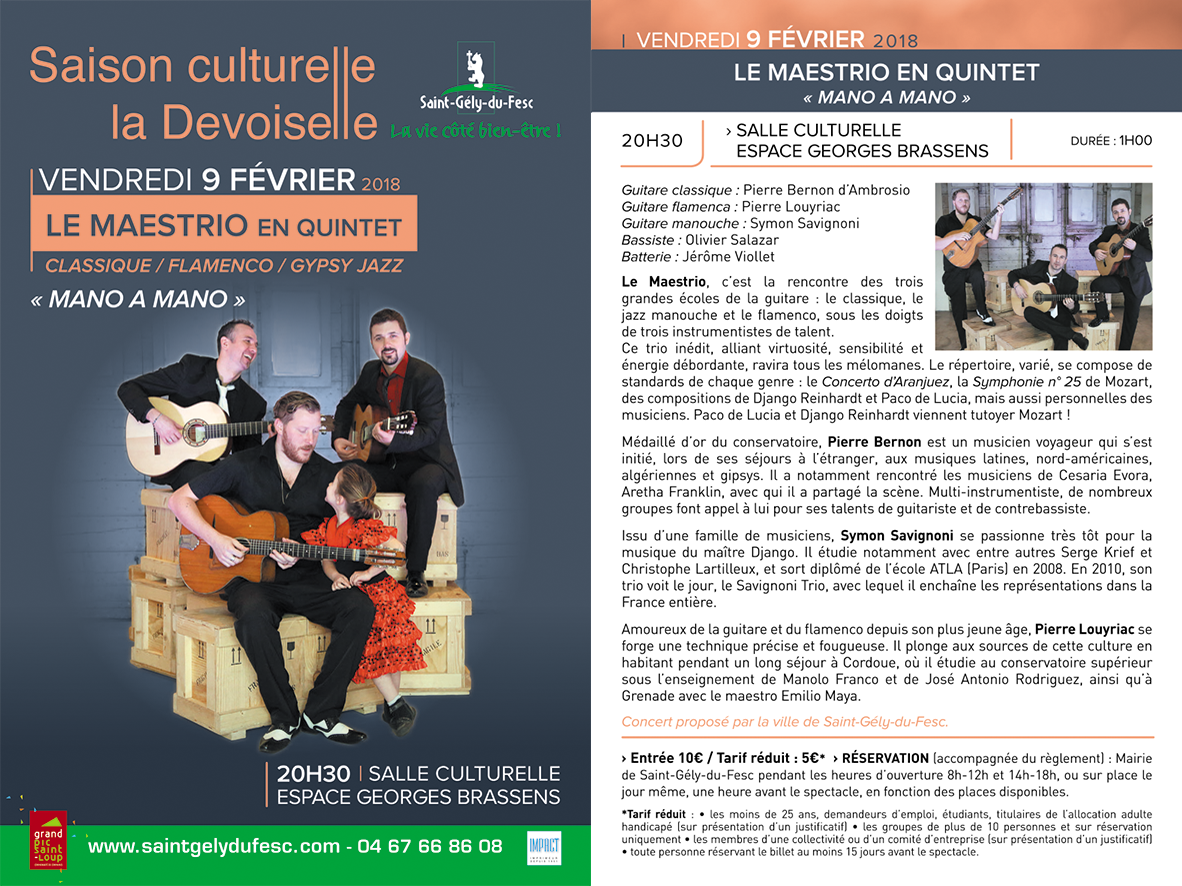 Le Maestrio, c’est la rencontre des trois grandes écoles de la guitare : le classique, le jazz manouche et le flamenco, sous les doigts de trois instrumentistes de talent. Ce trio inédit, alliant virtuosité, sensibilité et énergie débordante, ravira tous les mélomanes. Le répertoire, varié, se compose de standards de chaque genre : le Concerto d’Aranjuez, la Symphonie n° 25 de Mozart, des compositions de Django Reinhardt et Paco de Lucia, mais aussi personnelles des musiciens. Paco de Lucia et Django Reinhardt viennent tutoyer Mozart !