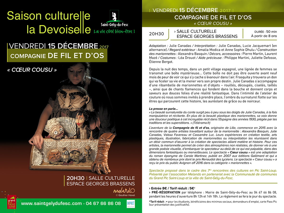 Le spectacle « Cœur cousu » est une adaptation du roman éponyme de Carole Martinez, publié en 2007 aux éditions Gallimard et qui a obtenu de nombreux prix dont le prix Renaudot des lycéens. Le spectacle « Cœur cousu » a reçu le prix du public Avignon off 2016 dans la catégorie « marionnettes ».