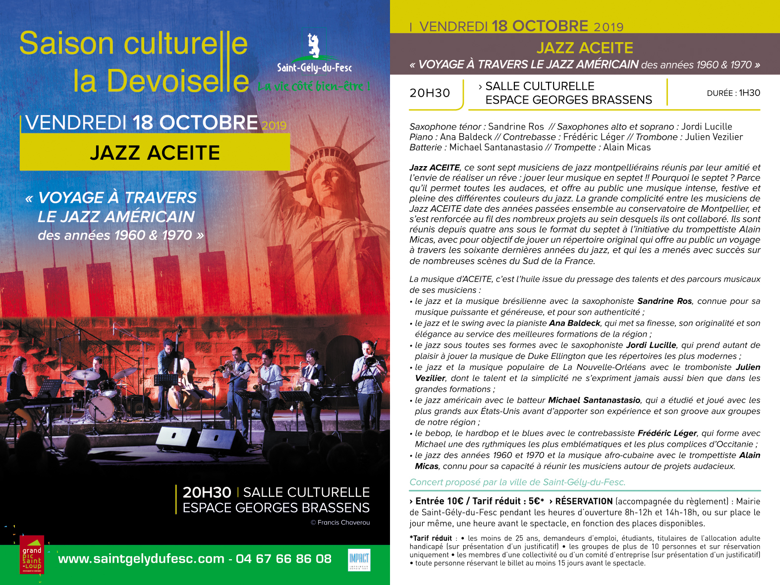 Jazz ACEITE, ce sont sept musiciens de jazz montpelliérains réunis par leur amitié et l’envie de réaliser un rêve : jouer leur musique en septet !! Pourquoi le septet ? Parce qu’il permet toutes les audaces, et offre au public une musique intense, festive et pleine des différentes couleurs du jazz. La grande complicité entre les musiciens de Jazz ACEITE date des années passées ensemble au conservatoire de Montpellier, et s’est renforcée au fil des nombreux projets au sein desquels ils ont collaboré. Ils sont réunis depuis quatre ans sous le format du septet à l’initiative du trompettiste Alain Micas, avec pour objectif de jouer un répertoire original qui offre au public un voyage à travers les soixante dernières années du jazz, et qui les a menés avec succès sur de nombreuses scènes du Sud de la France.