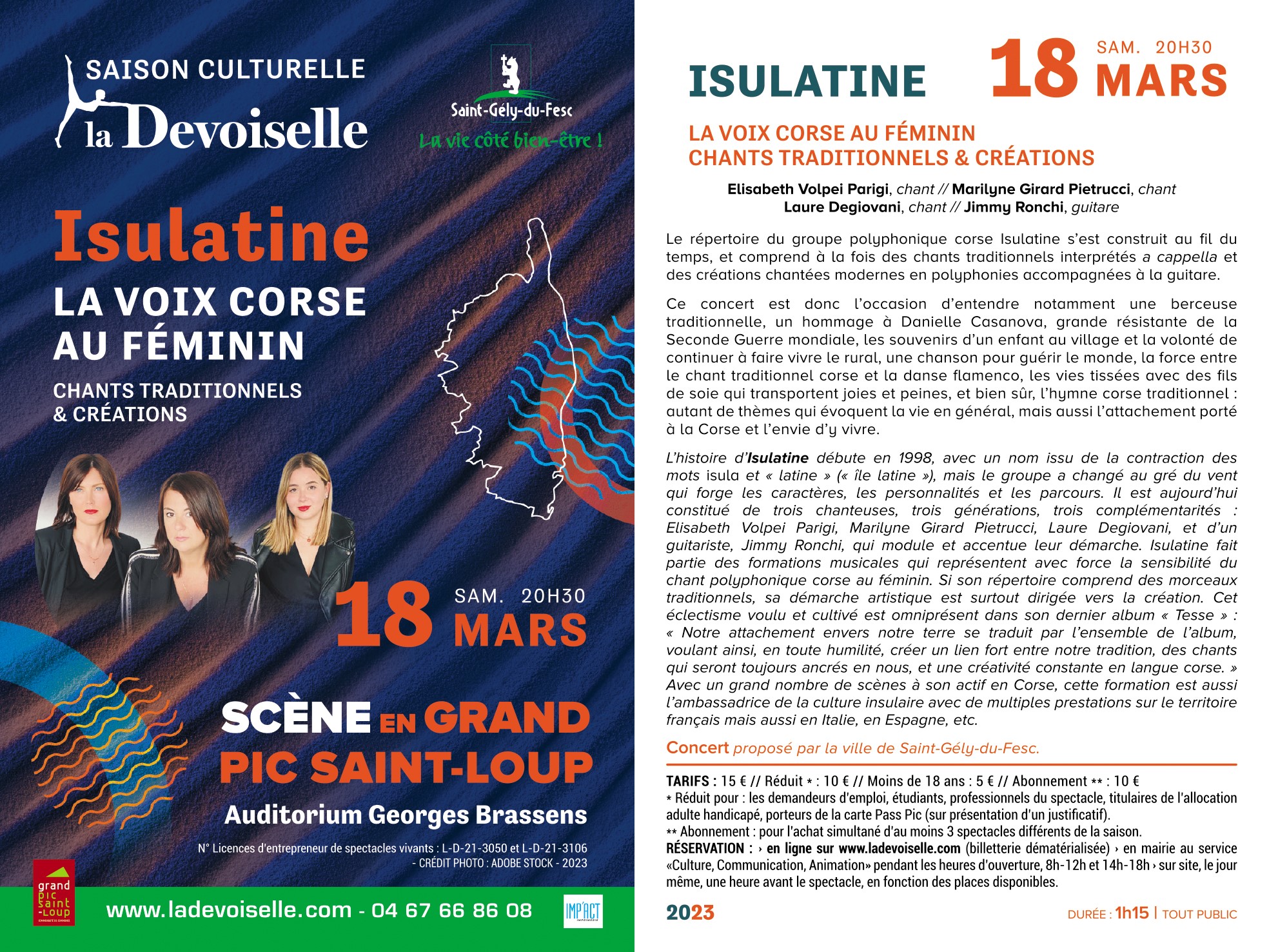 L’histoire d’Isulatine débute en 1998, avec un nom issu de la contraction des mots isula et « latine » (« île latine »), mais le groupe a changé au gré du vent qui forge les caractères, les personnalités et les parcours. Il est aujourd’hui constitué de trois chanteuses, trois générations, trois complémentarités : Elisabeth Volpei Parigi, Marilyne Girard Pietrucci, Laure Degiovani, et d’un guitariste, Jimmy Ronchi, qui module et accentue leur démarche. Isulatine fait partie des formations musicales qui représentent avec force la sensibilité du chant polyphonique corse au féminin. Si son répertoire comprend des morceaux traditionnels, sa démarche artistique est surtout dirigée vers la création. Cet éclectisme voulu et cultivé est omniprésent dans son dernier album « Tesse » : « Notre attachement envers notre terre se traduit par l’ensemble de l’album, voulant ainsi, en toute humilité, créer un lien fort entre notre tradition, des chants qui seront toujours ancrés en nous, et une créativité constante en langue corse. » Avec un grand nombre de scènes à son actif en Corse, cette formation est aussi l’ambassadrice de la culture insulaire avec de multiples prestations sur le territoire français mais aussi en Italie, en Espagne, etc.