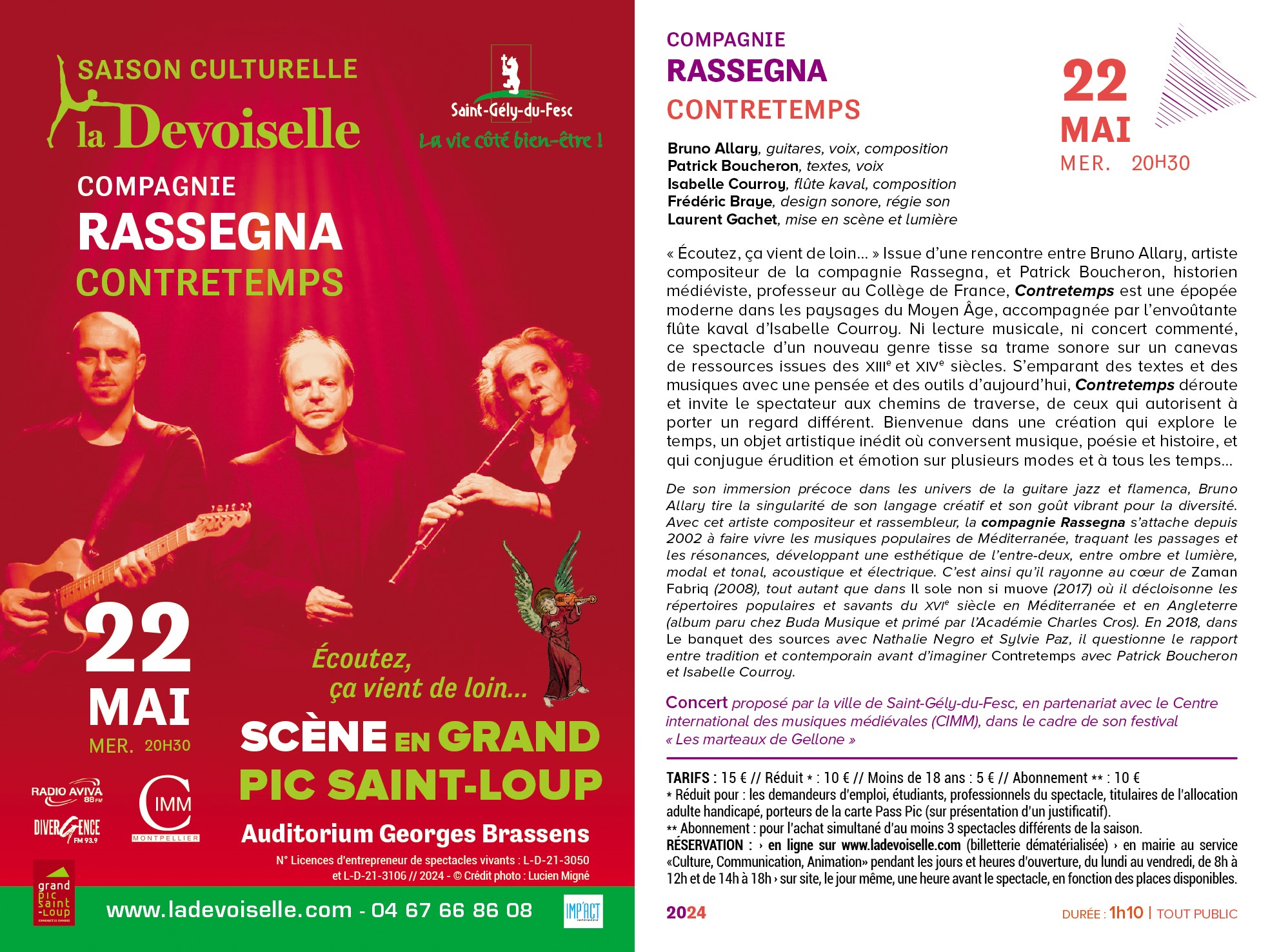 « Écoutez, ça vient de loin… » Issue d’une rencontre entre Bruno Allary, artiste compositeur de la compagnie Rassegna, et Patrick Boucheron, historien médiéviste, professeur au Collège de France, Contretemps est une épopée moderne dans les paysages du Moyen Âge, accompagnée par l’envoûtante flûte kaval d’Isabelle Courroy. Ni lecture musicale, ni concert commenté, ce spectacle d’un nouveau genre tisse sa trame sonore sur un canevas de ressources issues des XIIIe et XIVe siècles. S’emparant des textes et des musiques avec une pensée et des outils d’aujourd’hui, Contretemps déroute et invite le spectateur aux chemins de traverse, de ceux qui autorisent à porter un regard différent. Bienvenue dans une création qui explore le temps, un objet artistique inédit où conversent musique, poésie et histoire, et qui conjugue érudition et émotion sur plusieurs modes et à tous les temps…